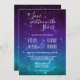 Les invitations à un mariage céleste comportent une typographie de script disant, A Love Written in the Stars, avec violet, blues, et ciel d'aqua nuit avec des étoiles scintillantes Faire-part de mariage.