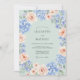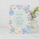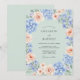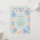 Cette conception présente un fond vert menthe doux orné d'une bordure luxuriante de fleurs aquarelles. Des hortensias bleus poussiéreux délicats et des roses pêche pâle créent une esthétique romantique et éthérée pour un événement saisonnier. Le style artistique met en valeur les pétales douces et les feuilles verdoyantes pour un look gracieux et inspiré de la nature.