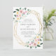 Invitations de mariage élégantes et fleuries avec vos détails mariages entourées d'un cadre géométrique en feuille d'or imitation orné de bouquets de fleurs d'aquarelle rose, violet et blanc (pivoines et roses) et de feuilles d'eucalyptus vert luxuriant. Les invitations féministes à un mariage floral se retournent vers une arrière - plan rose pâle.