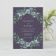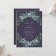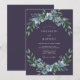 Cette conception présente un riche fond prune qui crée une atmosphère sombre et sophistiquée. Des florales délicates à l'aquarelle dans des nuances de bleu poussiéreux et de vert sauge forment un arrangement botanique luxuriant. De petites fleurs élégantes ressemblant à des pensées et des roses sont nichées parmi des feuilles douces et effilées. Cette palette aux tons froids est idéale pour une soirée saisonnière.