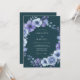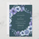 Cette conception présente une palette sombre de sarcelle profonde associée à des florales éthérées aux tons froids. Des roses délicates de pérywinkle et des anémones lavande créent une bordure luxuriante sur le fond sombre et dramatique. Des brindilles de feuilles fantaisistes ajoutent une touche de nature à cette esthétique élégante d'hiver ou de soirée. Parfait pour un événement saisonnier raffiné.