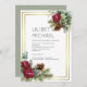 De beaux roses bordeaux, des feuilles eucalyptus, des cônes de pin et d'autres éléments festifs d'hiver figurent sur cet objet de mariage d'hiver moderne. Une partie d'une collection plus grande qui comprend des invitations à des mariages à petit budget, des rsvps, enregistrer les dates, des autocollants de remerciement, des cadeaux de étiquettes, des cadeaux de mariage et de mariage, des cadeaux de cartes photos, et plus encore. pour un guide gratuit détaillé sur la façon de planifier le mariage parfait d'hiver avec beaucoup d'idées de mariage d'hiver visitez weddingdesignchic.com.