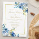 De belles roses bleues et blanches élégantes ornent cette invitation de mariage soirée florale. Le cadre chic en faux or est accentué de jolies fleurs d'aquarelle indigo et d'un charmant brin botanique jaune clair. Les noms des mariés sont écrits en script doré classique à l'intérieur de la bordure rectangulaire de cette invitation d'hiver moderne.