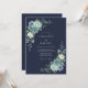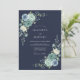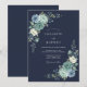 Un bleu marine profond fournit un fond dramatique pour ce design hivernal élégant. Des arrangements floraux délicats à l'aquarelle présentent des roses dans des nuances de bleu poussiéreux et de crème, accentués de feuillage et de baies de sauge vert. La palette aux tons frais et les éléments botaniques créent une atmosphère sophistiquée et formelle parfaite pour un événement saisonnier.