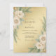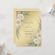 Un fond doré scintillant fournit une base luxueuse pour ce design saisonnier. Des roses crème délicates sont disposées avec art avec des aiguilles de pin vert sauge hivernal et des branches de cèdre pour créer une esthétique botanique sophistiquée. Cette palette métallique mélange la chaleur avec des éléments floraux doux pour une atmosphère formelle et opulente.