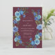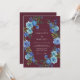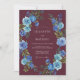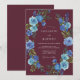Cette conception présente un fond bordeaux profond accentué par un arrangement vibrant de roses bleues et de feuillage verdoyant. La palette de couleurs sombre crée une atmosphère sophistiquée parfaite pour une cérémonie de mariage de fin de saison. Les détails aquarelles picturaux apportent un sens d'art et d'élégance à l'exposition florale.