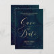 Un "save the date" calligraphié, avec un fond aquarelle bleu foncé et le texte en or.
