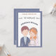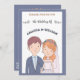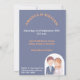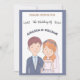 La faire-part de mariage présente une charmante illustration d'une mariée et d'un marié. Le marié est représenté avec des cheveux bruns courts, un teint clair, et porte une veste de costume bleu marine sur une chemise bleu clair et une cravate blanche. Il a une petite boutonnière épinglée sur son revers. La mariée se tient à côté de lui, souriant doucement. Elle a des cheveux ondulés, rougeâtre-oranges, ornés d'une couronne de fleurs rose, orange et blanche. Un délicat voile blanc coule derrière elle. Elle porte une robe mariage blanche avec un collier d'amoureux et un collier de perles. Cette illustration simple, en forme de dessin animé, suggère un lien amoureux des cordes entre eux. C'est fantaisiste et attachant, donnant un ton joyeux au prochain mariage. Le texte de l'invitation est gardé le moins possible pour un sentiment général simple où l'amour est le seul élément important ! Tous les champs sont entièrement personnalisables. Vous pouvez laisser vides les champs que vous ne voulez pas utiliser (par exemple le rsvp si vous préférez une carte séparée) arrière - plan bleu.