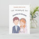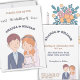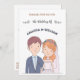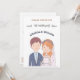 La faire-part de mariage présente une charmante illustration d'une mariée et d'un marié. Le marié est représenté avec des cheveux bruns courts, un teint clair, et porte une veste de costume bleu marine sur une chemise bleu clair et une cravate blanche. Il a une petite boutonnière épinglée sur son revers. La mariée se tient à côté de lui, souriant doucement. Elle a des cheveux ondulés, rougeâtre-oranges, ornés d'une couronne de fleurs rose, orange et blanche. Un délicat voile blanc coule derrière elle. Elle porte une robe mariage blanche avec un collier d'amoureux et un collier de perles. Cette illustration simple, en forme de dessin animé, suggère un lien amoureux des cordes entre eux. C'est fantaisiste et attachant, donnant un ton joyeux au prochain mariage. Le texte de l'invitation est gardé le moins possible pour un sentiment général simple où l'amour est le seul élément important ! Tous les champs sont entièrement personnalisables. Vous pouvez laisser vides les champs que vous ne voulez pas utiliser (par exemple, le rsvp si vous préférez une carte séparée ) arrière - plan blanc.