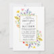 Le Faire-part de mariage moderne Watercolor Fleur sauvage comprend des fleurs sauvages délicates jaune, rose, pêche, bleu poussiéreux, vert sauge, violet, rouge et orange, des pavots, des feuilles d'eucalyptus et d'autres belles plantes botaniques sur un cadre doré. Élégant Script de calligraphie. Retour Photo Couple.