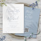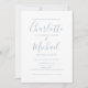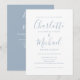 Comportant des noms de style signature, cette élégante invitation de mariage poussiéreuse bleue peut être personnalisée avec toutes vos informations spéciales de jour de mariage au recto et les détails de votre site web de mariage et code QR au verso. Conçue par Thisisnotme©
