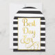 Cartes d'invitation de mariage élégantes à rayures noires avec éléments dorés. Option « Meilleur jour jamais » en or au dos de la carte. Élément de tourbillon mignon en or en haut sur le devant. Noms de la mariée et du marié dans une calligraphie fantaisiste avec juste ce qu'il faut d'élégance et de fantaisie. Moderne, rayures noires et blanches, or, Meilleur jour jamais, vos bordures de motif rayé organique romantique sur les deux côtés avec une étiquette de texte pour votre message de mariage. Calligraphie de caractères artistiques en or.