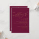Découvrez l'élégance et la modernité avec notre Faire-part de mariage Mulberry et Gold Modern. Cette invitation unique, qui présente un script de calligraphie contemporain et agité en frappant de l'or sur un arrière - plan Mulberry profond, est un chef-d'oeuvre en soi. La teinte Mulberry profonde dégage romantisme et sophistication, tandis que le texte Gold chatoyant ajoute une touche d'opulence. L'écriture moderne danse gracieusement à travers la carte, créant un design unique qui capture parfaitement l'essence de votre journée spéciale. Pour les couples à la recherche d'une faire-part de mariage alliant un charme intemporel à une touche moderne, notre Faire-part de mariage Mulberry et Gold Modern est le choix ultime. Ce n'est pas seulement une invitation ; c'est une oeuvre d'art qui reflète votre histoire d'amour et qui prépare le terrain pour une célébration mariage inoubliable. Choisissez l'invitation qui incarne votre style unique - le Faire-part de mariage Mulberry et Gold Modern. Vos invités seront captivés par son élégance et sa modernité, laissant une impression durable de votre journée spéciale.