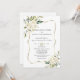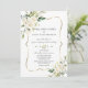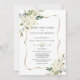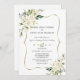 Carte de mariage élégante avec des fleurs blanches délicates peintes à l'aquarelle et des feuilles vertes, un cadre doré faux, un séparateur floral, sur fond blanc. Au dos, bouquet de fleurs blanches, séparateur floral, initiales. Utilisez l'outil Personnaliser pour ajouter vos informations, modifier les polices et leurs couleurs. Pour les articles assortis, veuillez visiter ma collection Fleurs Blanches Délicates.