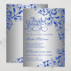 © Socialite Designs. Une invitation élégante de bleu royal et d'argent avec de magnifiques tourbillons décoratifs dans les coins prête à être personnalisée pour votre événement spécial. Le style de police, le texte et le type de papier peuvent être modifiés. Besoin d'AIDE pour la personnalisation ou des produits supplémentaires avec ce design ? N'hésitez pas à contacter Socialite Designs.