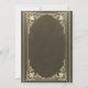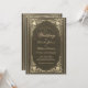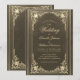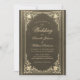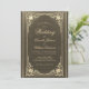 Cette élégante invitation de mariage à l'atmosphère vintage, recommandée pour un mariage plus formel "black tie", comporte un cadre doré vintage avec des décorations baroques dorées élégantes sur un fond simili-cuir noir. Les noms des mariés et le mot Mariage sont écrits dans une police calligraphique élégante. Tout le texte peut être personnalisé et a une couleur dorée similaire au cadre doré vintage.