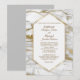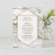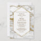 Le fond de cette invitation de mariage formelle élégante et attrayante est une image de marbre blanc avec des paillettes dorées antiques fausses qui la traversent. Au centre se trouve une bannière hexagonale blanche encadrée d'or brillant. Votre texte de mariage est en or antique foncé au centre, et il y a suffisamment d'espace pour votre personnalisation. Le dos de l'invitation est d'un gris moyen uni. Élégant pour les mariages formels en toute saison !