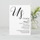 Cette faire-part de mariage élégante et moderne présente un thème noir et blanc. Le titre "Us" est imprimé en gros caractères en haut, au-dessus des noms du couple se mariant. Les informations mariages sont imprimées ci-dessous dans une police noire sophistiquée.