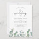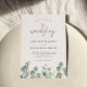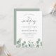 Une invitation de mariage moderne présentant un design simple, des accents de verdure d'eucalyptus aquarelle dans un style élégant de calligraphie et de couleur sauge.