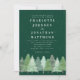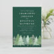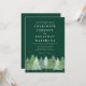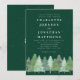 Faire-part de mariage d'hiver avec des sapins à l'aquarelle et une typographie moderne élégante sur fond vert émeraude