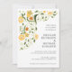 Invitations de mariage artistique avec fleurs jaunes, orange et turquoises, vignes et feuilles dans le coin gauche, sur un arrière - plan blanc. Les détails de votre événement sont alignés à droite et à droite des fleurs et des vignes. Le côté arrière est vert et peut être changé à n'importe quelle couleur que vous souhaitez. Ce design est idéal pour un mariage de jardin en été.