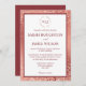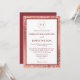 Cette invitation de mariage moderne et élégante présente un message encadré de couleur bordeaux et est bordée d'un motif de paillettes de rose doré luxueux en arrière-plan. Personnalisez vos détails en utilisant une écriture facile à lire. Cette invitation moderne utilise un format moins formel mais comprend les informations de base que les invités doivent savoir. Elle comprend un beau monogramme en cercle de rose doré en haut de l'invitation et le dos de l'invitation est de la couleur bordeaux correspondante au cadre.