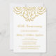 Cette invitation élégante et vintage pour une fête d'anniversaire de mariage présente une délicate embellissement en damas doré sur fond blanc.