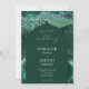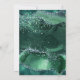 Cette invitation présente une aquarelle vert émeraude dans l'imitation de géodes d'agate bordées de fausse feuille verte et de fausse parties scintillant verte et argentée. Le texte apparaît en blanc sur une forme d'arc vert foncé, avec le mot "mariage" dans le script décoratif. Le dos reprend la conception de l'agate de parties scintillant vert émeraude.