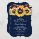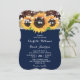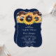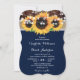 Faire-part de mariage floral bleu marine rustique avec tournesol et lampes à cordes contre un arrière - plan rustique en bois, burlap et dentelle. Deux coeurs de burlap à l'arrière. Personnalisez facilement cette carte de mariage avec vos coordonnées de mariage.