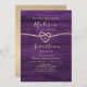 Invitation simple, élégante et moderne de réception de mariage en bois violet avec calligraphie et corde dorée en forme de cœur.