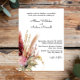 Cette faire-part de mariage romantique présente un thème bohème floral. Un beau bouquet d'herbe boho pampas est représenté sur la gauche. L'image de style aquarelle présente des fleurs séchées, des plumes et des tiges dans des tons chauds de beige, de marron, de blush et de rose. Les informations sur les mariages et l'emplacement des lieux sont imprimés dans une police noire élégante à côté de l'herbe de la pampa.