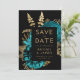 Ce mariage élégant et maussade Save the Date card présente un bouquet floral luxuriant et romantique en turquoise avec fausse feuille d'or et feuillage de parties scintillant sur un arrière - plan noir. Customisez le texte de couleur or dans des polices de style sur un rectangle noir, puis ajoutez l'URL de votre site Web mariage au dos noir solide.