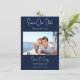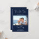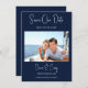 Un mariage sauvez la date Photo Thème de la marine nautique dans la marine sombre et blanche. Pour personnaliser, insérez simplement l'image de votre couple préféré dans notre modèle facile. Cliquez sur FIT et assurez-vous qu'il est centré sur la page. Ensuite, insérez votre texte dans notre modèle facile, en remplaçant l'exemple Noms, Date du Mariage et Emplacement.