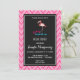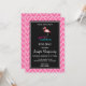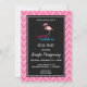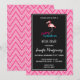 Une invitation à une fête de fiançailles avec une illustration graphique d'un flamant rose. Le texte dit : Mariage Fabuleux à plumage. Le motif de fond est un motif chevron dessiné à la main en rose et blanc.