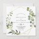 Ce faire-part de mariage feuille tropical vert est parfait pour un mariage rustique. Le design présente de beaux feuilles verts peints à la main, ornant un cadre géométrique doré.