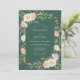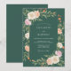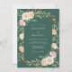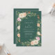 Un riche fond émeraude crée une toile sophistiquée pour une délicate création florale. Des fleurs douces de pêche et de rose se mêlent à une verdure luxuriante, formant une bordure charmante. Ce design évoque une ambiance romantique et élégante pour une célébration spéciale.