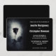 Une invitation de mariage sombre et mystérieuse avec une illustration cool d'une rose noire de style gothique/emo avec du sang rouge qui coule de ses pétales. Un fond noir grunge avec une couleur blanc cassé au centre mettant en valeur cette rose sombre et macabre.