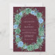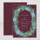 Cette création présente un riche fond de bourgogne orné d'une abondante couronne de succulentes vert tendre et de délicates fleurs bleues. L'esthétique globale évoque une atmosphère romantique et naturaliste, parfaite pour une occasion élégante en plein air ou botanique.