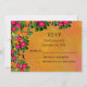 Un mariage à thème floral rsvp. La bordure supérieure et gauche est entourée de fleurs sauvages roses et oranges nichés dans un lit de feuilles verts. L'arrière - plan est un design abstrait avec des couleurs tourbillonnantes, mélangeant et se mélangeant dans le jaune orange et le rose.