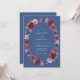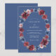 Une couronne ovale romantique de fleurs peintes de bourgogne et de bleu orne ce design. L'arrangement floral riche évoque un sentiment de charme classique et de romance sophistiquée. Ce design est parfait pour une occasion intemporelle et élégante.