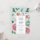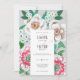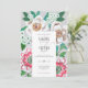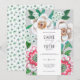 Carton d'invitation de mariage peint à la main avec feuilles vertes et fleurs blanches et roses sur fond gris et petites couleurs d'accent fuchsia.