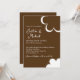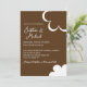 Cette invitation de mariage présente un thème rétro inspiré des années 1970. Le fond est d'une couleur marron chocolat, avec du texte marron et les noms des mariés imprimés dans une police de caractères élégante. Une fleur blanche de style années 70 est imprimée en bas à droite, avec un contour de fleur assorti en haut.
