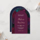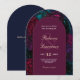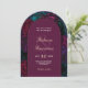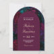 Une invitation de mariage florale de luxe de couleur joaillerie avec de riches fleurs de couleur bordeaux, violettes et vertes, joliment disposées autour d'un élégant cadre en arc sur un fond bleu foncé. Le design botanique audacieux et la palette de couleurs dramatiques créent un look romantique et sophistiqué, parfait pour les cérémonies officielles, les célébrations en soirée et les mariages élégants en plein air. Cette invitation unique en forme d'arche ajoute une touche moderne tout en mettant en valeur des florales vibrantes et une élégance intemporelle.