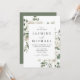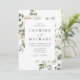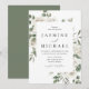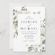 L'invitation de mariage floral blanc élégant présente vos noms et détails de mariage encadrés par des feuilles d'eucalyptus peintes à l'aquarelle, un feuillage vert luxuriant, des roses blanches et crème, et des fleurs de lisianthus.