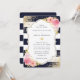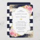 Elégante faire-part de mariage florale rayée bleu marine et blanc avec confettis d'or et rose rousse, fleurs de pêche et d'ivoire et verdure dorée. Éléments correspondants disponibles.