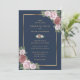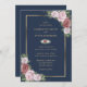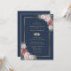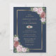Invitation vos invités à votre élégante fête de mariage bleu marine et roux avec ces invitations à mariage florales avec des roses roses roses blush ornant un cadre doré sur un arrière - plan bleu marine.