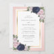 Elégante faire-part de mariage fleurie bleu marine et rousse avec fleurs bleues et roses rousses. Éléments correspondants disponibles.