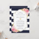 Elégante invitation à mariage bleu marine et blanc avec fleurs de rose, d'ivoire et de pêche et verdure dorée sur un arrière - plan rayé bleu marine et blanc. Éléments correspondants disponibles.