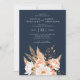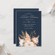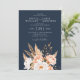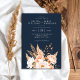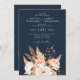 Faire-part de mariage à thème floral bleu marine avec des accents boho chic de fleurs d'aquarelle de roses de pivoine et d'herbe de pampas. Simple à personnaliser avec les détails de votre mariage pour vos invités dans une élégante typographie minimaliste.