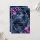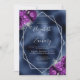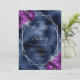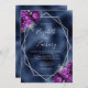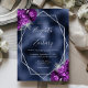 Cette élégante faire-part de mariage moderne présente un cadre géométrique argenté décoré de bouquets floraux violets et argentés sur un arrière - plan bleu marine en imitation feuille. Le texte personnalisable combine écriture fantaisie gris argenté, cuivre et polices italiques.